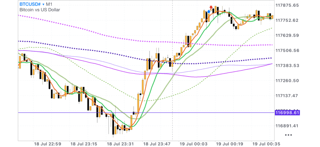 その後、5時半くらいに116,900ドルのどん底での調整のトラバースがあり、6時に上がるという妄想があって入り損ねました。