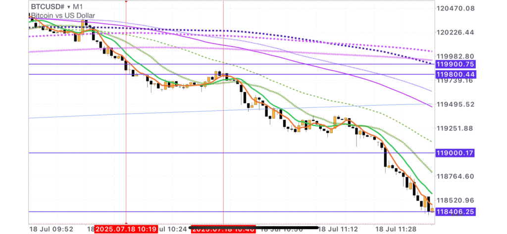 4時間以上前の昼12時に分析を出していて、16時半に119,900でショートエントリーする際はすぐに利確する指示を出して、エントリー値を119,800に変えて再エントリーの指示を出して、その価格に達した途端にグンと下がって、最初は300ドル落ちて、しばらくして119,000ドルを割りました。