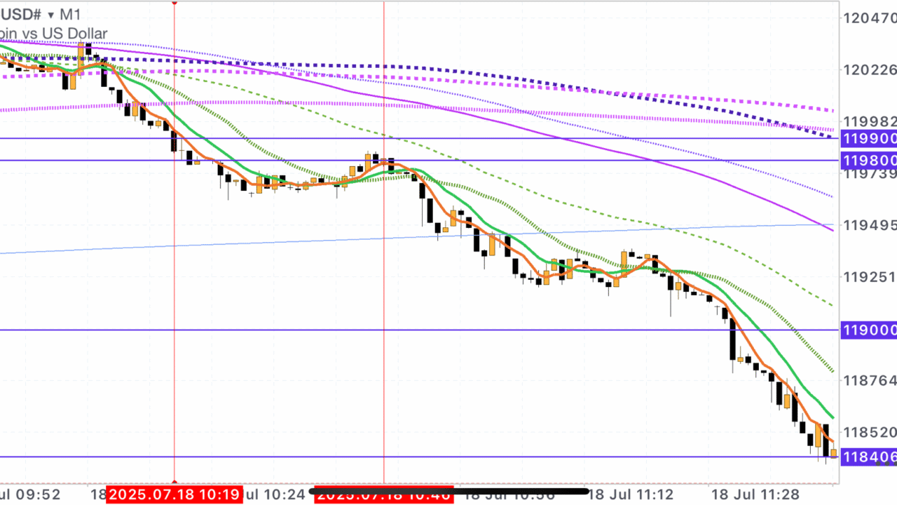 4時間以上前の昼12時に分析を出していて、16時半に119,900でショートエントリーする際はすぐに利確する指示を出して、エントリー値を119,800に変えて再エントリーの指示を出して、その価格に達した途端にグンと下がって、最初は300ドル落ちて、しばらくして119,000ドルを割りました。