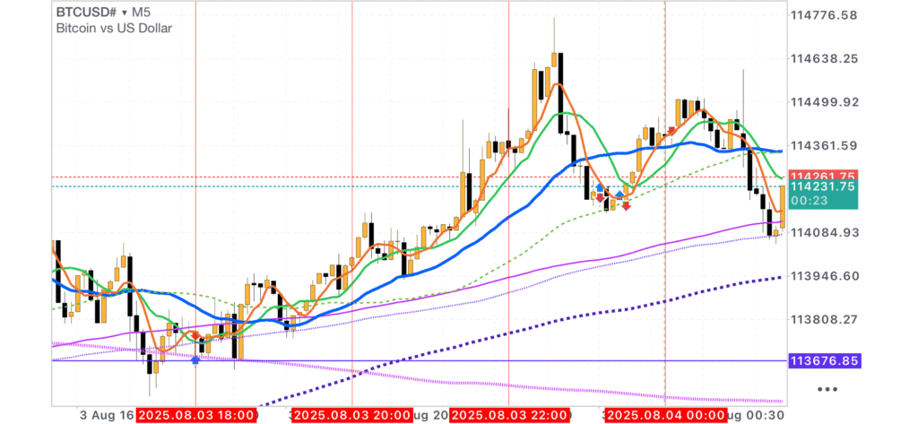振り返ってみると、やっぱり0時台の動きは重要で、0:30の113,650を底値に、無傷で114,700まで1,000ドル上がったことがわかります。重点として記憶しておきます。