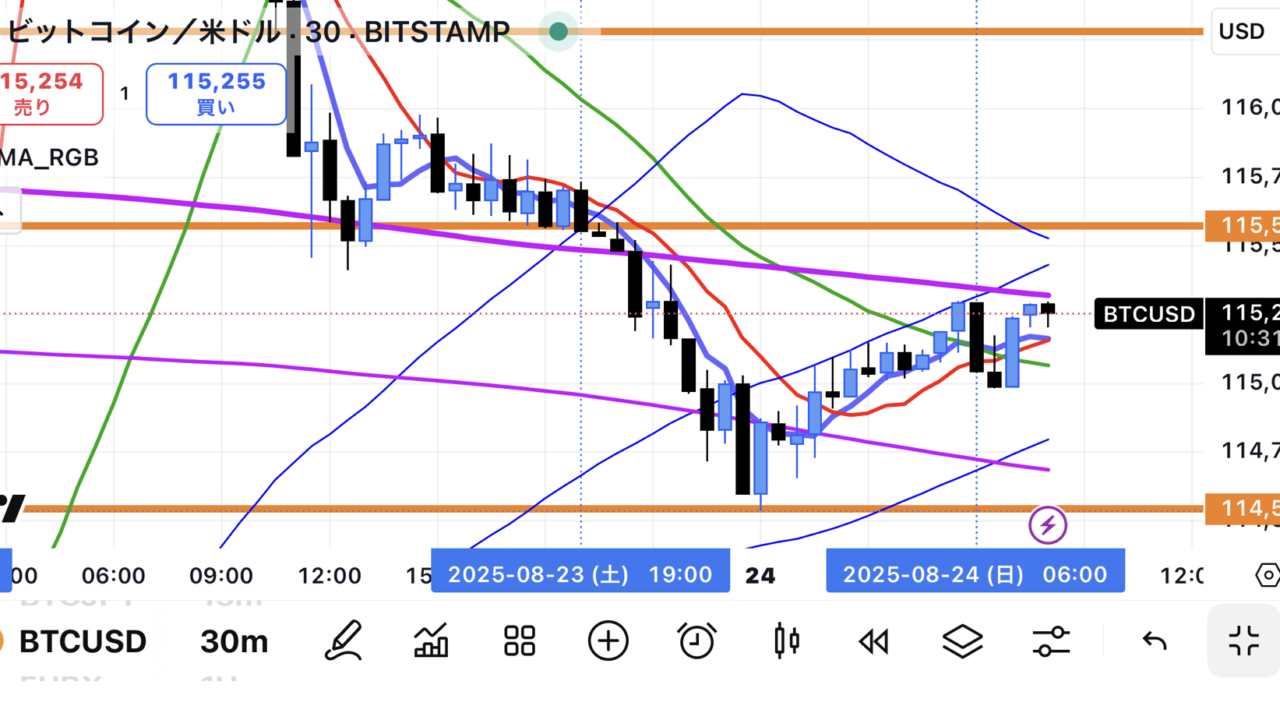 移動平均線で見ても下降トレンドの中の調整の上げとは思うけど、30分足で綺麗なシグナルが出ているのは気づかなかった。