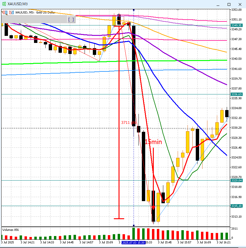 上に上がるのは確信できたはずなのに、視界の中に、30分前まで下落方向を考えていたため、7月3日の下落のチャートが出してあって、その3分足のロウソク足の形に似てきたので、止まってしまった。
