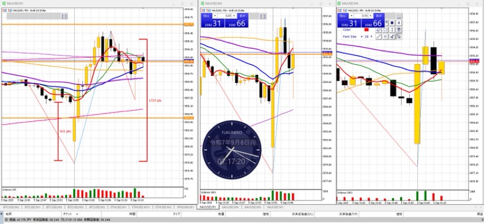 トレード日誌 9月7日(日)動くタイミングが分からずノートレード週明けの急上昇の入り方の考察 paint_saurus 2025年9月9日 / 2025年9月12日 週明けの急上昇は、1分区切りではなく、30秒区切り。 30秒になったらエイッと入る。 #ゴールド動向【週明け】速すぎて入れませんでした。7時ちょうどにいったん下落して、たぶん、30秒後に上昇に変わった。ロウソク足の速さに気を取られず、方向だけ確認して、7時0分30秒を目指してロングを打つなら、できるかもしれない。 pic.twitter.com/0p3h4H0cBL— paint_saurus (@paint_saurus) September 7, 2025 #ゴールド動向 週明けの動き9/1(月)戻り売り8/25(月)下落のシグナルからの下落の続き8/18(月)上ヒゲ2ドル(200ドル)伸ばして1分後に下落8/11(月)押し目買いで上昇 pic.twitter.com/gRSVJJBcUP— paint_saurus (@paint_saurus) September 7, 2025