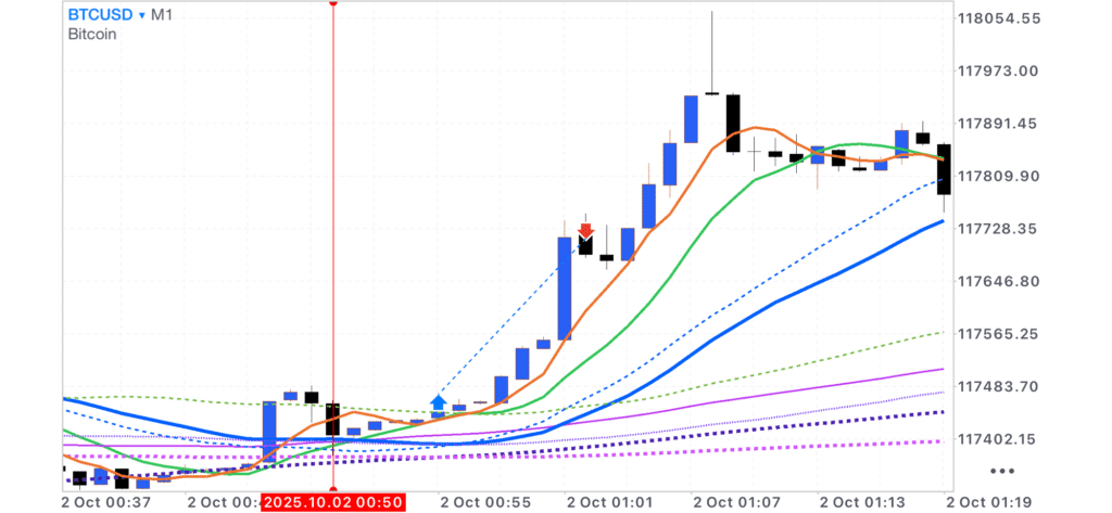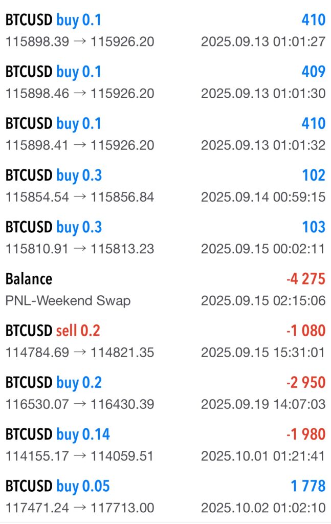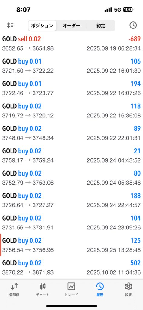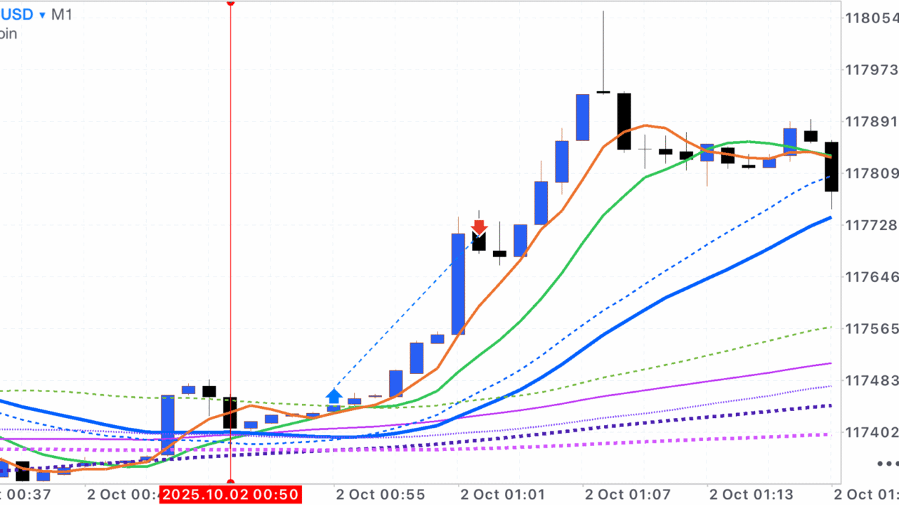 トレード日誌 9月30日(火)10月1・2日(水・木)ウツ進行中、2回だけトレード、引っ越しの準備は停滞中 paint_saurus 2025年10月3日 この10月に入って2日間の勝ち数17pips-10pips+24pips=31pips この数値を大きくしないとプロにはなれない。 XMの状況 最初の負けは23pips 2回目の勝ちは13pips 最後の勝ちは17pips それ以外は1桁で逃げた。 押し目で入るのが怖くて、結果もっと怖い目に遭う。 #ゴールド日記このあと80pipsのびましたが、度胸がありません。 pic.twitter.com/DtlkriFnTu— paint_saurus (@paint_saurus) October 2, 2025 このあと取り返したけど、ツイートできなかった。 #ビットコイン日記完全に下降トレンドの一瞬だけの上昇で、ちょうど15分だからという理由だけでロング一瞬あがって含み益もでたけれど、逃げ遅れた。 pic.twitter.com/lGtKA5wPVn— paint_saurus (@paint_saurus) September 30, 2025 大きな負けは10pipsくらい ロットが大きかった 最後の勝ちは24pips 移動平均線からまだ上がるのがわかる。