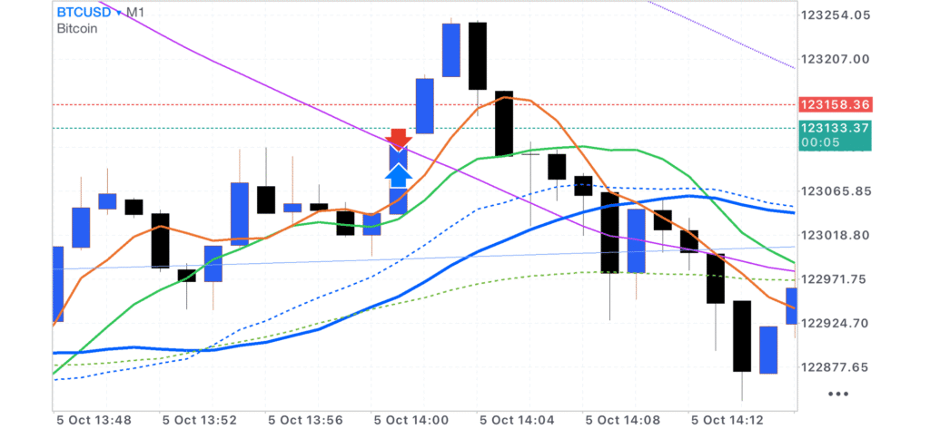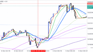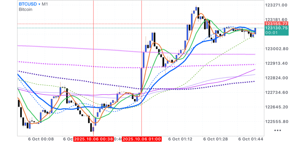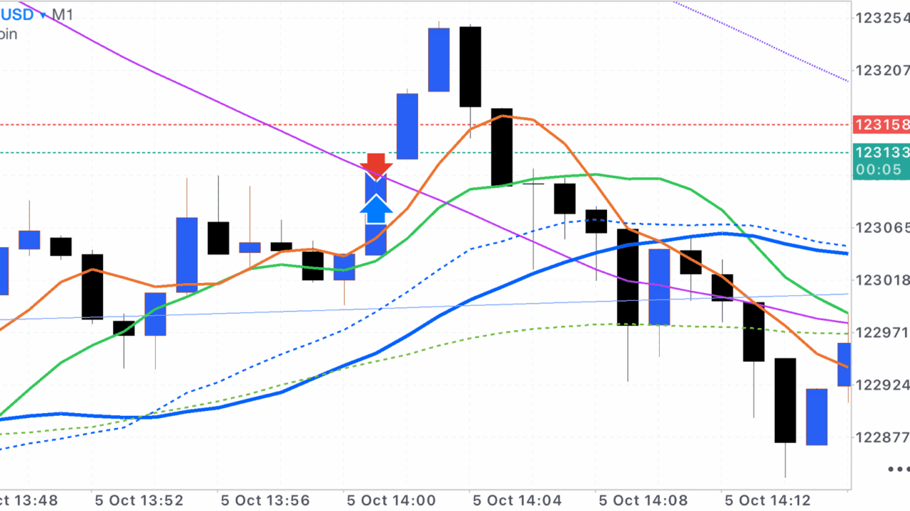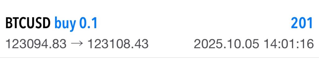 未分類 10月5日(日)朝6時58分、MAを突き破って。週初めの上昇。覆い被さるMAを怖がらないこと。 paint_saurus 2025年10月6日 昨日の朝は6時1分に上昇して、3,000ドル上がった。 今日の朝は、7時2分前、6時58分に上昇して、いまも上昇中。 10月に入ってからの稼ぎは、46pips 昨日取れたのが、14pips 合わせて60pips このくらいを、1日で取れれば、30日で、1,800pips 集中力と、あきらめない気持ち。