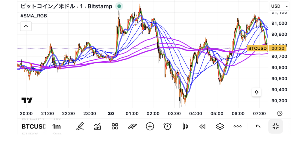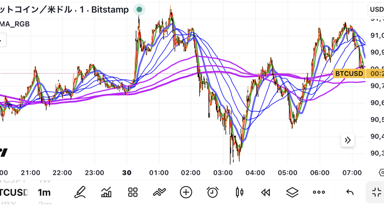未分類 11月29日(土)土日モードでもキリ時間に400ドル、600ドルの動き paint_saurus 2025年11月30日 20時からの上昇、21時からの下落、24時からの上昇、途中はムリとして、5時からの上昇は600ドル‼️ 起きていたのに、上がる起点が5:09で、MAが迫っていてリターンムーブが建値近くまでくる危うさで、みんな時間を頼りに買い付けたんだろうと思う。5:16にも同じ価格まで2回目のリターンムーブが来て、そこに乗れば良かった。 #ビットコイン動向24時ちょうどから、400ドル上昇。まだ上がる。入り損ねました。 pic.twitter.com/H1S56KfltN— paint_saurus (@paint_saurus) November 29, 2025